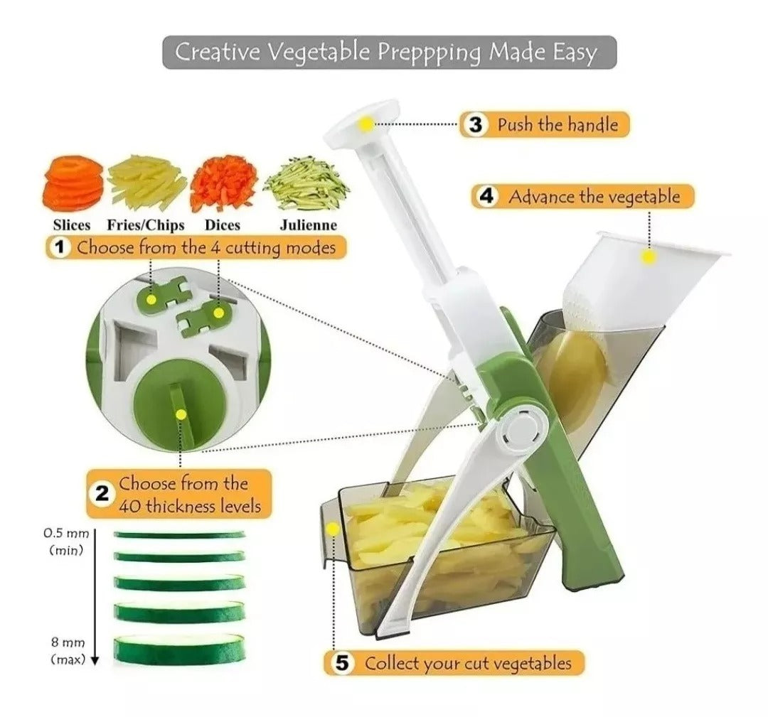 "Establezcamos una alianza sólida y segura. Nos comprometemos a ofrecerte productos de alta calidad para impulsar tu negocio hacia nuevos horizontes. Juntos, podemos alcanzar nuevas alturas y lograr un crecimiento exitoso. ¡Confía en nosotros para brindarte excelencia en cada paso de este camino hacia el éxito empresarial!"WhatsApp +56921964477 Scarlett Muñoz /Horario de lunes a viernes desde las 10:00-18:00 hrs CORTADOR REBANADOR MANDOLINA MULTIFUNCIONAL Contiene:Simplifica la preparación de tus comidas saludables con el Picador de Papas y Verduras Brava Multifuncional Mandolina. Este utensilio práctico y novedoso hará que cortar frutas y verduras sea una tarea sencilla y rápida.Características principales:Versatilidad en la Cocina:Este picador multifuncional no solo corta papas, sino que también es ideal para una variedad de frutas y verduras. Una herramienta versátil que simplificará tus tareas en la cocina.Manual del Procesador de Alimentos:Una alternativa eficiente y de ahorro de energía en comparación con los procesadores eléctricos. El Twist Cut realiza el trabajo de varias herramientas de cocina tradicionales con facilidad.Funcionamiento Sencillo:Basta con empujar el mango hacia abajo y ver cómo tus frutas y verduras se cortan de manera uniforme y precisa. Su diseño intuitivo hace que sea fácil de usar para cualquier persona.Inserto de Cuchilla Eficiente:El inserto de cuchilla afilada garantiza un corte preciso de frutas, verduras y hierbas. Obtenga resultados uniformes en cada uso.Preparación Rápida y Segura:Ahorra tiempo en la preparación de tus comidas gracias a la eficiencia de este picador. Además, su diseño seguro hace que sea una opción práctica para tu cocina.Simplifica tu rutina en la cocina y disfruta de comidas saludables de manera rápida y eficiente con el Picador de Papas y Verduras Brava Multifuncional Mandolina. ¡Descubre la conveniencia de este utensilio todo en uno! 1 manual, 1 cortador, 1 cuchilla, 1 contenedor, 1 pieza para cortar, 1 tubo para ajustarNOTA: Variedad de colores, se envía color según stock disponible en bodega