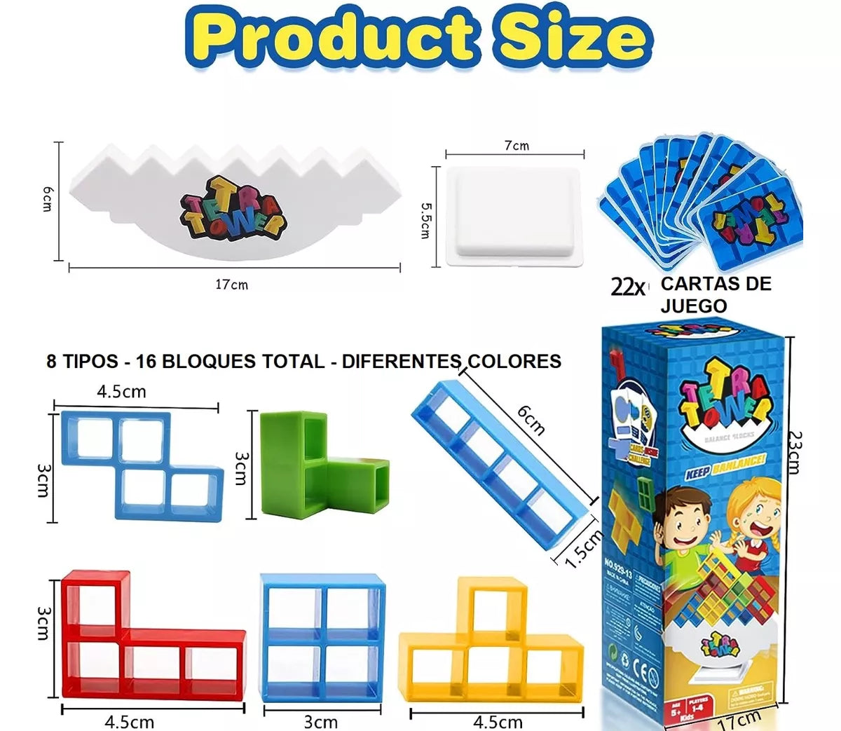 El paquete incluye: 16 bloques de equilibrio, 22 tarjetas de juego, 1 base blanca y 1 plataforma blanca.
